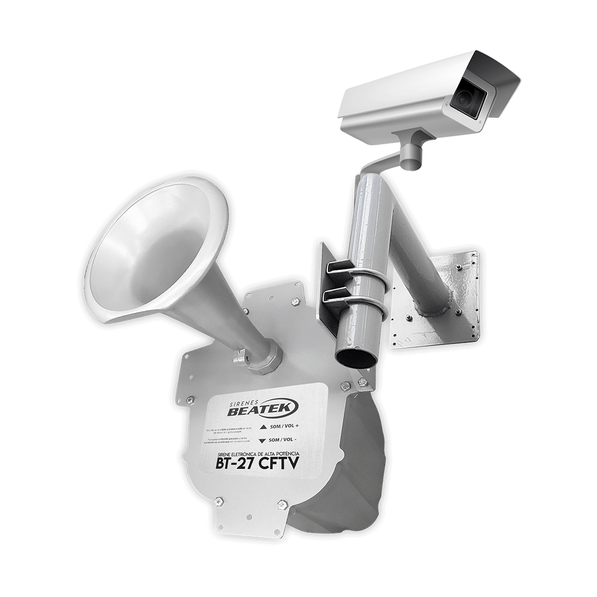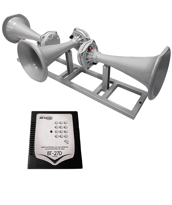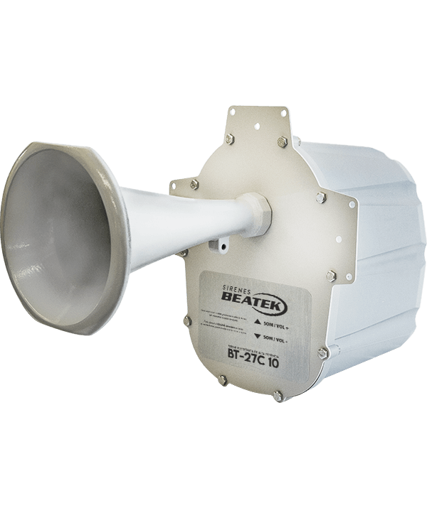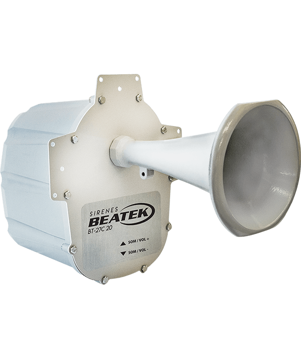 A Sirene Eletrônica BEATEK BT-27C 20 é ideal para emissão de alertas em longa distância. Neste modelo, a prioridade de acionamento é Programada no Sistema do Cliente (CLP), conectado à sirene. Reproduz até 08 sons diferentes de uma lista de 18 sons disponíveis, um para cada situação.